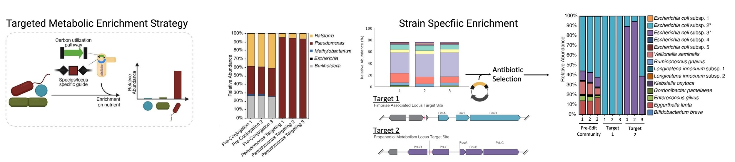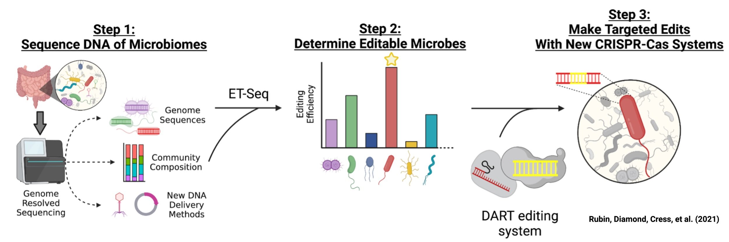 - Genomic Characterization: First a microbial community is sequenced and the genomes of the organisms present are assembled to understand the community composition and provide the template for editing.