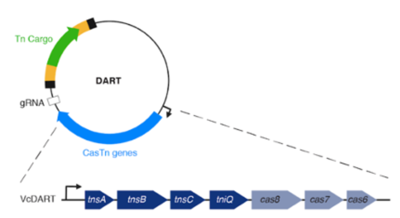 DART: Once it is determined that an organism in a microbial community can acquire and integrate exogenous DNA, a method is necessary to target DNA delivered to the community to that specific organism and only that organism. For this we have developed DNA-editing all-in-one RNA-guided CRISPR–Cas transposase (DART) systems for locus-specific insertion of DNA into organisms within a microbial community. The DART system uses an RNA-guided CRISPR–Cas Tn7 transposase to deliver cargo DNA that is between transposon repeats on a plasmid into a specific location of a target genome defined by the guide RNA (gRNA) also encoded on the same plasmid. These systems also include barcodes that make them compatible with ET-Seq to allow for the detection and tracking of uniquely edited cells. Thus, DART can be used seamlessly with ET-seq for rapid assay of the efficacy of CRISPR–Cas-guided transposition into the genome of a target organism in the absence of selectable markers.