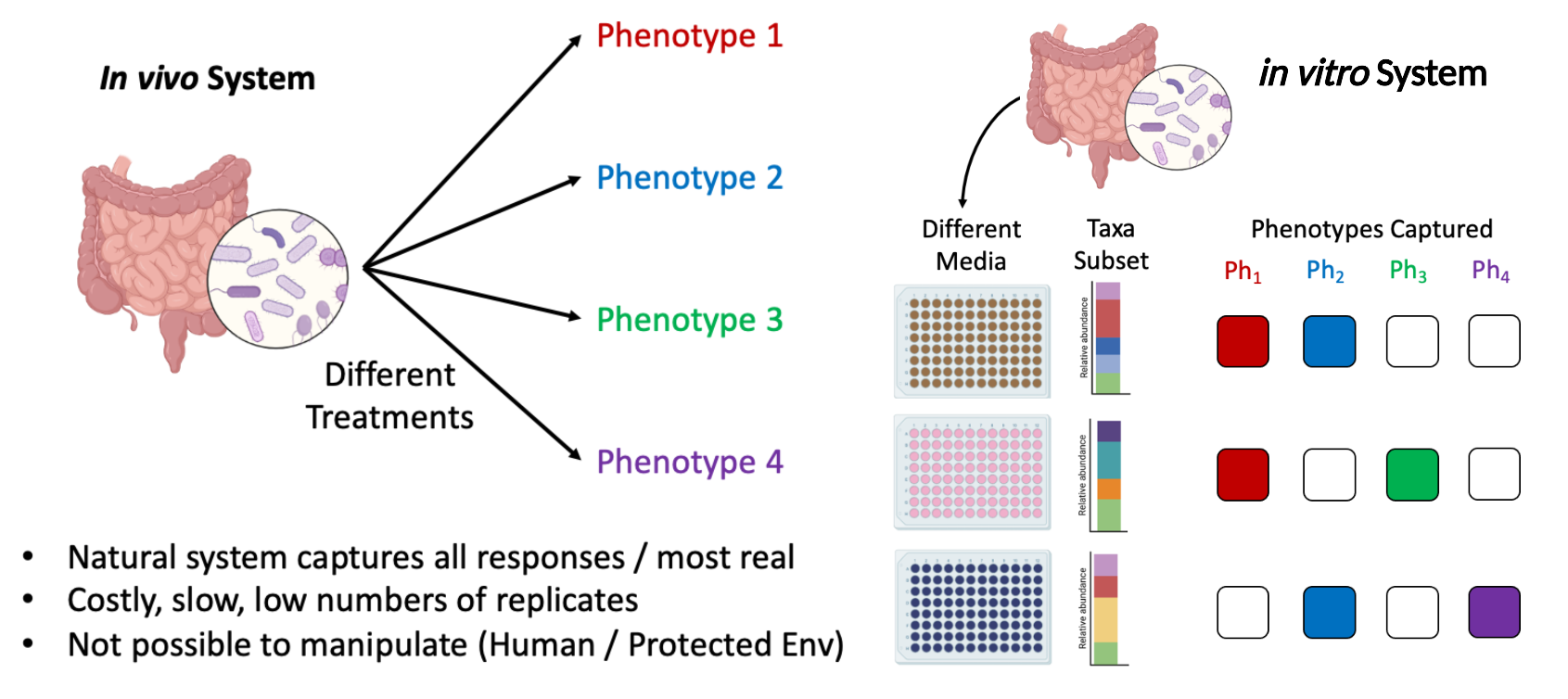 We hope to overcome these issues through the development and genome-resolved metagenomic characterization of in vitro human microbiome systems that are reflective of host microbiomes and recapitulate host phenotypic responses. As development of these systems is in the early stages, it is likely that additional modifications to growth conditions will result in in vitro communities that even more realistically capture phenotypes of their hosts. By using in vitro community cultivation we can explore an extremely wide set of growth conditions and experimental perturbations without the need for human or animal subjects.
